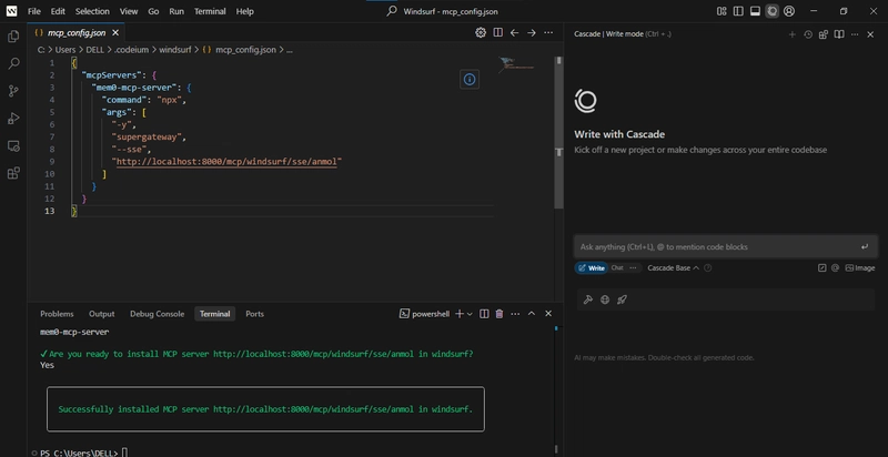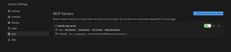 docker-composecommand. - The API process itself hosts an MCP server (using Mem0 under the hood) that speaks the standard MCP protocol over SSE.