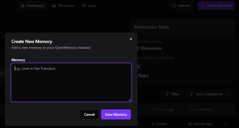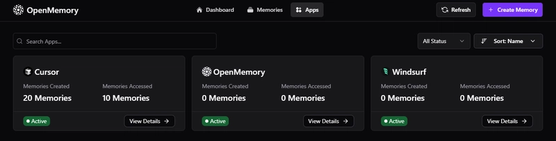 The OpenMemory dashboard includes three main routes:/ – dashboard/memories – view and manage stored memories/apps – view connected applications
