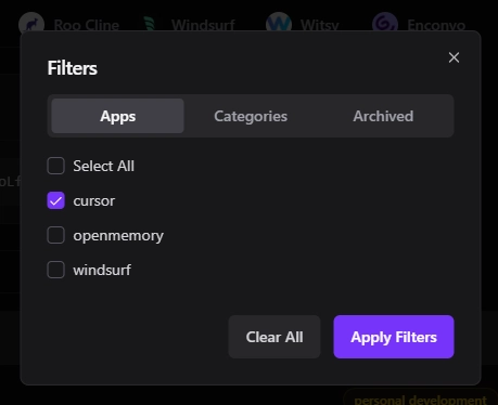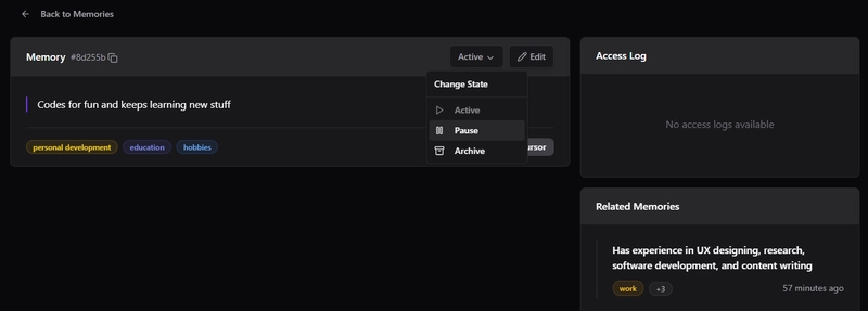 In practice, you can pause an entire app (disabling writes), archive or pause individual memories, or apply filters by category or user. Paused or non-active entries are hidden from tool access and searches. This layered access model ensures you can gate memory access at any level with confidence.