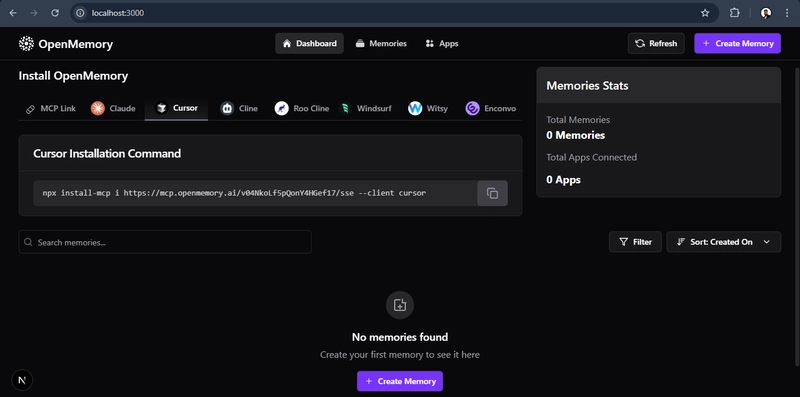 After successful installation, you can navigate to http://localhost:3000 to check the OpenMemory dashboard, which will guide you through installing the MCP server in your MCP clients.