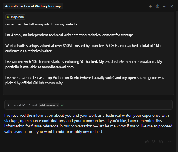 Open a new chat in Cursor and give a sample prompt like I've asked it to remember some things about me (which I grabbed from my GitHub profile).