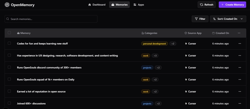This triggers the add_memories() call and stores the memory. Refresh the dashboard and go to the Memories tab to check all of these memories.